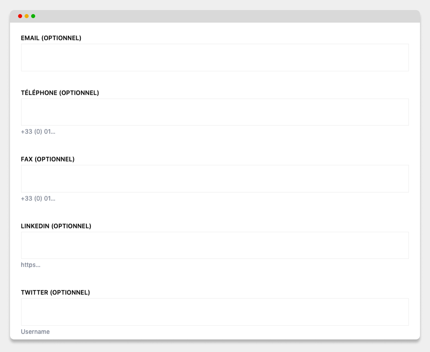 Vous pouvez ajouter différents types de contact pour votre agence, actuellement les champs de saisis possibles sont :
