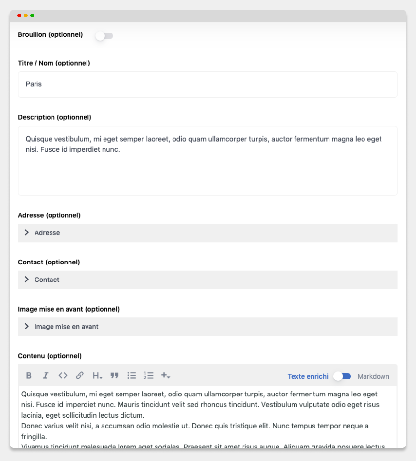 Titre, description, image par défaut, contenu…